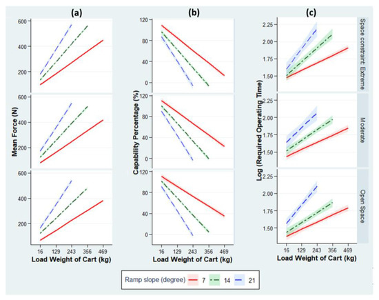 Finally, the impact of the ramp slope on the ROT is statistically significant, while the magnitude of the impact varies under different loads (Figure 9c). For the baseline cart load (16 kg), the ROT to overcome a ramp is 2.19% longer for every 1° increase in slope; however, the ROT gap between two ramps differing in slope by 1° grows increasingly wider as the carts are more heavily loaded (by 0.015% for every 1-kg increase in cart load).