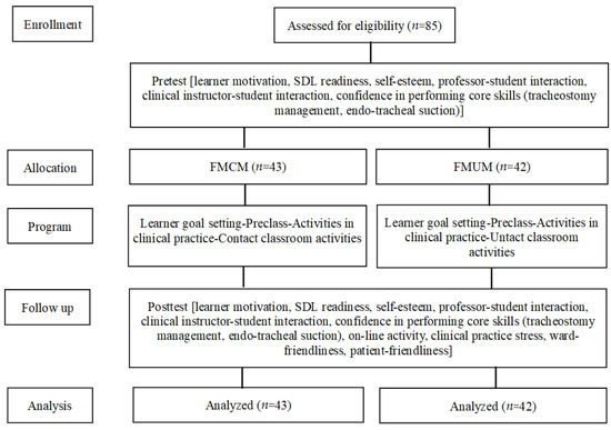 This was a randomized control trial with two groups and a pretest–posttest study. Participants were third-year college students who were engaged in their clinical practicum and attending a nursing college in Seongnam City in Korea. The number of samples was calculated using G*Power version 3.1.9.4 [19] and applying the following criteria: effect size (f2) = 0.65; significance level (α) = 0.05; and power (1-β) = 0.80. Based on prior literature [20], two-tailed tests and independent t-tests were utilized for analysis; the results showed a required sample size of 39 per group (i.e., n = 78 participants). In total, 85 students—who voluntarily agreed to participate—were randomly allocated to each group using a computerized random number generator. Then, the FMCM and FMUM courses were delivered to 43 and 42 students, respectively. No participant dropped out of the study (Figure 1).