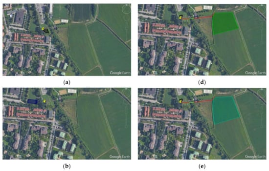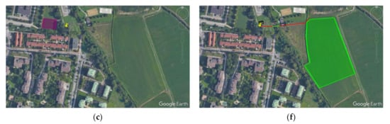Plan view of the areal footprint and positioning of the different alternatives: (a) Alternative 1. 1, primary treatment only (primary only); (b) Alternative 1.2, first flush tank, minimum size according to local regulation (FFT—min); (c) Alternative 1.3, first flush tank, maximum size according to local regulation (FFT—max); (d) Alternative 2.1, constructed wetland with a single stage (VF); (e) Alternative 2.2, multistage constructed wetland (VF+ FWS); (f) Alternative 2.3, multistage constructed wetland sited in a newly developed urban park (VF + FWS park).