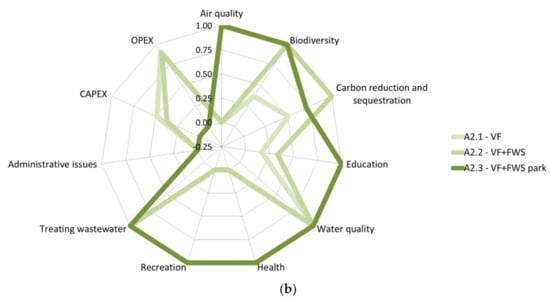 Graphical representation for the evaluation matrix of the MCA (after criteria normalizan. for the two groups of alternatives: (a) Grey infrastructure; A1.1: primary treatment only (primary only). A1.2: first flush tank, minimum size (FFT—min). A1.3: first flush tank, maximum (FFT—max). (b) Green infrastructure. A2.1: vertical subsurface flow CW (VF). A2.2, vertical subsurface flow plus free water surface CW (VF + FWS). A2.3, vertical subsurface flow plus free water surface CW in an urban park (VF + FWS park).
