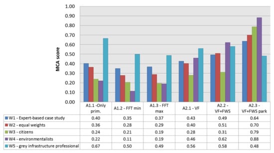 Results of the sensitivity analysis, with the MCA scores obtained assuming different weights for all the alternatives. A1.1: primary treatment only (only primary). A1.2: first flush tank, minimum size (FFT—min). A1.3: first flush tank, maximum (FFT—max). A2.1: vertical subsurface flow CW (VF). A2.2, vertical subsurface flow plus free water surface CW (VF + FWS). A2.3, vertical subsurface flow plus free water surface CW in an urban park (VF + FWS park).