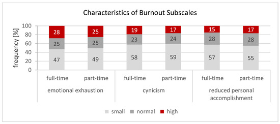 The expression of the burnout subscales also did not differ in a practically significant way between full-time and part-time teachers (Figure 1). Around a quarter of all teachers recorded high levels of exhaustion, 18% reported high levels of cynicism and 17% reported poor professional efficacy.