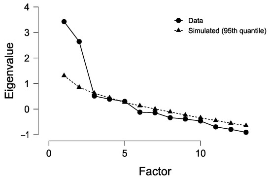Exploratory factor analysis was performed on the resulting dataset, using generalized least squares as the estimation method. The aim of this multivariate method is to reduce data dimensionality and to identify relatively few underlying factors explaining the observed correlations among variables. Furthermore, a lower number of independent factors may be obtained starting from many correlated variables, and the former may be used for subsequent analysis, simplifying the analytical task [15,16]. In the present study, the aim was mainly the latter in order to reduce the number of analytical variables, to test for a possible correlation with traditionally widely used biometric indexes (Pearson and Spearman correlation methods), and to develop possible indexes of fish physiological status and general wellness to be adopted in confined, artificial (fish farming) and/or natural systems. SPSS 14.0.1 (SPSS Inc., Chicago, IL, USA) and JASP 0.14.1 [17] were used as statistical packages.