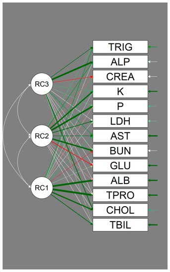 Accordingly, TBIL, TPRO, ALB, and CHOL are clearly associated with Factor 1, and the latter result is also associated with Factor 3. GLU, BUN, AST, LDH, P, and K are associated with Factor 2, whereas CREA, ALP, and TRIG are mainly associated with Factor 3, with CHOL being shared with Factor 1, as underlined in Table 5.