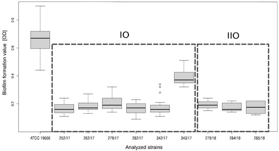 All (100%) of the investigated strains had the ability to form a biofilm, but all of them produced 3.5-fold less biofilm than the reference strain (post hoc Dunnett analysis) (details in Figure 1). Comparison of biofilm production by strains isolated from IO and IIO showed that there was no difference in biofilm production, except strain 343/2017, which produced more biofilm than other strains (post hoc Tukey analysis) but still less than the reference strain (details in Figure 1).