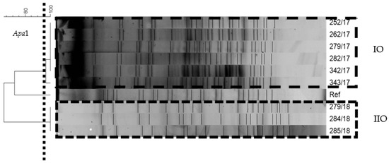 Pulsed-field gel electrophoresis dendrogram of A. baumannii strains belonging to IO and IIO, generated by the Gel Compar II software (Dice coefficient, tolerance 1%, optimization 1%). The scale indicates a percent similarity of the pulsed-field gel electrophoresis (PFGE) profiles. The dotted line indicates 95% similarity values of the PFGE profiles. The frames contain strains qualified for the first (IO) and second (IIO) outbreaks. Ref is the A. baumannii ATCC 19606 reference strain, Apa1 is the cutting enzyme.