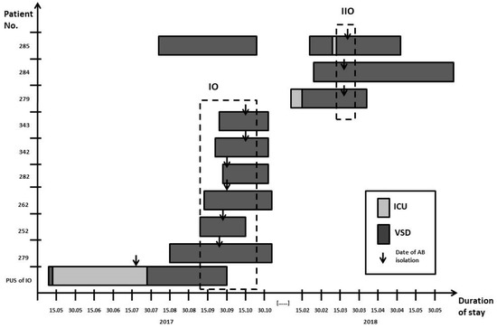 Outbreak measures in the timeline of the two outbreaks causing by XDR A. baumannii isolates. ICU—intensive care unit, VSD—vascular surgery department, IO—first outbreak, IIO—second outbreak, AB—A. baumannii. The arrow marks the date of isolation of A. baumannii strains. The frames represent the duration of the first (IO) and second (IIO) outbreaks.