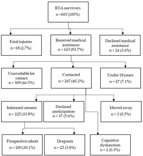 A prospective cohort was followed between December 2016 and September 2017. The research was conducted at the Institute of emergency medicine of Vukovar-Srijem County in Croatia and it was approved by the Ethics Committee of the Faculty of Medicine Osijek, Croatia (Ethical Approval Code: 2158-61-07-17-211). A cohort of 200 RTC survivors was followed during six months after experiencing an RTC. Participants gave informed consent for participation in the study. Inclusion criteria were recent RTC experience and ≥18 years of age. Exclusion criteria were minor age and cognitive and mental health problems resulting in inability to give consent and provide necessary information. At one month and six months after an RTC, the participants gave information regarding their psychological and physical health status, socioeconomic status, compensation status, RTC characteristics, road traffic injuries (RTIs) and pre-RTC health status. Cohort recruitment is presented in Figure 1.