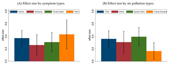 The effect size also varied by disease/symptom (Figure 2A) and VOC types (Figure 2B) as well as by age (Table 4). It is interesting to note that the effects of VOCs was more than two times higher than the effects of criteria pollutants (Figure 2B). Specific VOCs, such as formaldehyde and benzene, had the highest effect size. Although a limited number of studies have examined the association between indoor VOCs and respiratory health in the elderly population, the highest effect size was observed in the elderly population. It is interesting to note that the effect of VOCs in the adult population was 1.6 times higher than in the pediatric population (effect size 0.3 in the pediatric population versus 0.5 in the adult population).