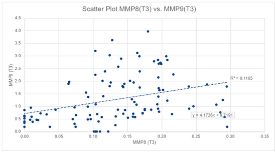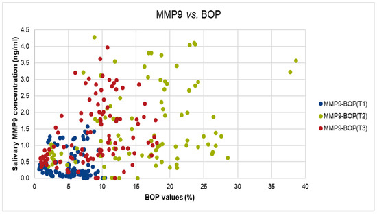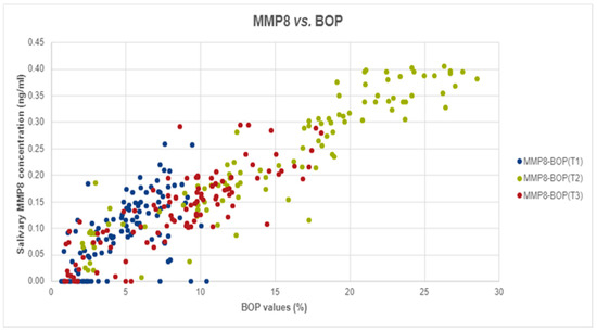 Spearman’s correlation was used to test whether there was a statistically significant linear relationship between MMP-8 and MMP-9 levels at all three stages: T1, T2, and T3. A significant and medium relationship was found between the two measurements at T3 (Spearman’s rho = 0.440, p-value < 0.01) and at phase T2 (Spearman’s rho = 0.239, p-value < 0.05). For a graphical visualization of this relationship, we used a scatter plot. The same type of correlation was used to test whether there is a statistically significant linear relationship between MMP-9 and BOP for all of the three stages: T1, T2, and T3. Two significant and medium relationship were found at phase T2 (Spearman’s rho = 0.314, p < 0.01) and T3 (Spearman’s rho = 0.426, p < 0.01).