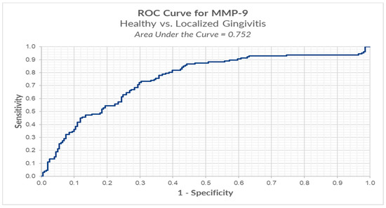 ROC analysis of MMP-9 in healthy versus localized gingivitis.