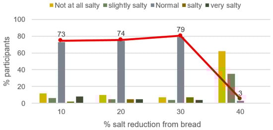 Results on bread saltiness perception by Tunisian consumers revealed that salt reduction in the bread-making process was not detected up to the 30% level as 79% of the selected participants found that this salt reduced bread had normal saltiness (Figure 3). However, only 3% of Tunisian consumers who tested the 40% salt reduction level in bread-making process estimated its salinity as normal.