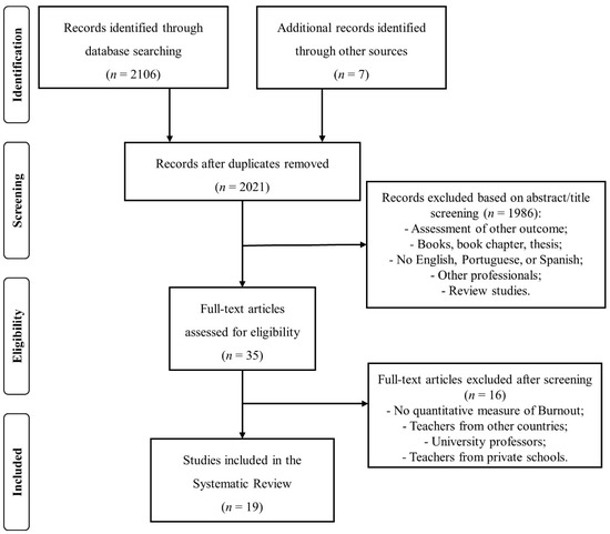 This research was completed in accordance with the Preferred Reporting Items for Systematic Review (PRISMA) guidelines [19]. The literature search included studies published until 25th September 2020 and was conducted using the following databases: PubMed MEDLINE, Scopus, and Web of Science. Keywords were defined based on previous investigations [5,6] and the aims of this study by the four authors (N.P.M., L.C.O.B.G., L.A.P., and I.L.). As part of the search strategy, the Boolean operators “AND” and “OR” were used in conjunction with the following keywords: Brazil, Brazilian, Teacher, Educationist, Educator, Instructor, Pedagogue, Tutor, Faculty, Burnout, “Emotional exhaustion”. Reference lists from relevant articles were also examined to find other potentially eligible studies.