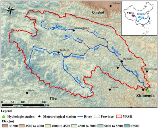 Yangtze River Source Region (Latitude: 32°25′ E and 35°53′ E; Longitude: 89°43′ E to 97°19′ E), located in the western Tibetan plateau, covers an area of 159,065 km2 (Figure 1). The elevation ranges from 6456 m in the West to 3512 mm in the East, with an average of 4779 m. The average annual precipitation is approximately 327.4 mm, which is concentrated from June to September. The average annual temperature is about −5.5–3.0 °C from northeast to southwest, with an average of 2.9 °C [27,29]. The drought index is 3.67 in the YRSR, which means the climate is very dry. The land cover in the YRSR consists primarily of grasslands (63.8%) and unused land (29.4%). Water area and forest land are less dominant land cover types, accounting for 6.5% and 0.3% of total area of YRSR. Due to the cold and dry climatic conditions, the eco-hydrology process of the whole region is sensitive to climate change.