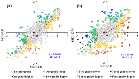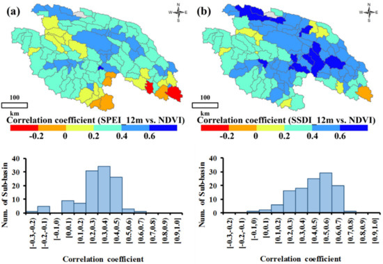 Drought event identification using the run theory for a given threshold level, SSDI = −1*: (a) the correlation coefficient between SPEI and NDVI; (b) the correlation coefficient between SSDI and NDVI; Note: sub-basins filled with grey mean there was no vegetation in these sub-basins; SSDI means standardized supply-demand water index.