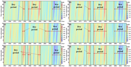 Hovmoller-type diagrams for the temporal variability of the SSDI from 1 to 24-month scales at different subregions: (a) Togton River Basin; (b) Middle stream; (c) Downstream; (d) Dam River Basin; (e) Qumar River Basin; (f) YRSR.
