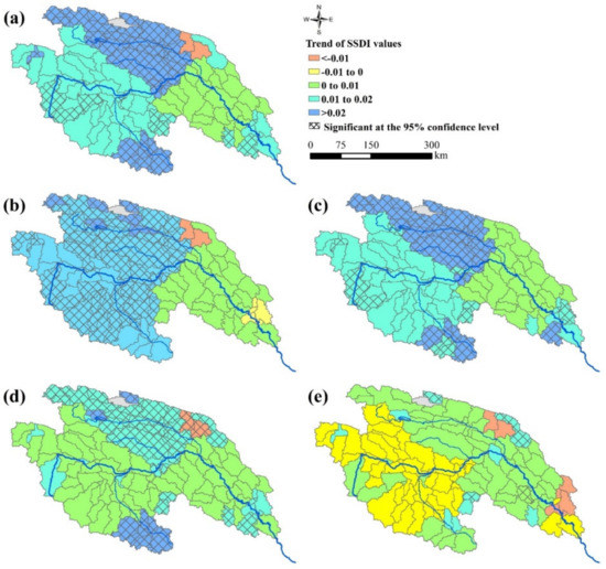 The trend of SSDI values during 1960–2016: (a) SSDI-12m of December; (b) SSDI-3m of May; (c) SSDI-3m of August; (d) SSDI-3m of November; (e) SSDI-3m of February. The crosshatch indicates that the trend is statistically significant at the 95% confidence level based on Mann–Kendall test.