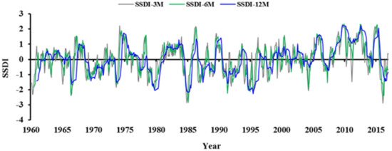 The interannual variability of the SSDI at different timescales is shown in Figure 4. We found that the SSDI series at different regions and the whole YRSR exhibit a wetting trend during 1960–2016. Taking the SSDI-12m of December as an example, the SSDI value increased by 0.0154 ± 0.0063 per year in the study period. It also can be seen that persistent droughts occurred frequently in 1977–1979 and 1984–1997, and periods of late-1970s, mid-1980s, and mid-1990s had witnessed the most severe drought episodes. A clear reversal of dry/wet condition in 2006 can be detected in Figure 3, which indicates that drought has been gradually relieved since mid-2000s. This change has happened largely because of the effects of climate change. A couple of studies have reported that the precipitation and actual evapotranspiration in the YRSR have been increased in the last decade [27,28,48]. In other words, the water supply for grassland and forest ecosystem would increase in this context, causing drought events to become less frequent in many regions of the YRSR.