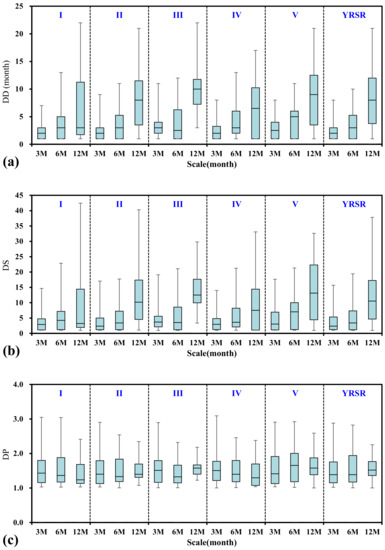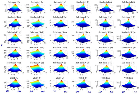 The bivariate return periods (T) of DD vs. DS, DD vs. DP and DS vs. DP for subregions I–V and the YRSR were estimated according to Equations (30) and (31), and results are illustrated in Figure 15. It can be found that various pairs of drought variables can result in the same return period. With the 3D-surface figure, the associated return period in Case ∩ and Case ∪ for a specific drought variable can be extracted. For example, DD = 6 months and DS = 6 result in TD∩S = 11.5 year and TD∪S = 6.2 years for the YRSR. The two kinds of return period are compared, and the “∪” return periods are shorter than the “∩” return periods in all the sub-basins and the entire YRSR. Further, the univariate and bivariate drought return periods for different variation patterns were compared (Table 3). Apparently, the univariate return period is longer than “∪” return periods, while shorter than the “∩” return periods. With the DD, DP and DS increasing, both the “∪” and “∩” return periods increased. In addition, the difference between “∪” and “∩” return periods would also increase as the values of drought variables increase. Taking the entire YRSR as an example, the DD, DS and DP were about 11.1, 17.2 and 1.8, respectively, in a situation whereby the univariate return period was 50 years. For this particular event, the TD∪S, TD∪S and TP∪S were about 34.1, 28.9 and 29.6 years while the TD∩S, TD∩S and TP∩S were about 93.3, 186.6 and 161.5 years. The results are important for drought risk assessment and would be helpful in planning and management of water resources systems under severe or extreme drought scenarios.
