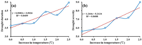 Sensitivity on average (a) drought duration (DD) and (b) severity (DS) due to temperature change in the YRSR.