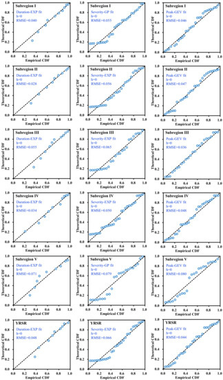 Comparison between empirical and theoretical CDFs of drought duration, severity, and peak in subregions I–V and entire YRSR. EXP, WBL, GP, GEV, and GAM are abbreviations for Exponential, Weibull, Generalized Pareto, Gamma, and Generalized Extreme Value distributions. The value of h is 1 if the test rejects the null hypothesis at the 5% significance level, or 0 otherwise. RMSE is the value of root-mean-square error. The dotted line indicates the 1:1 line.