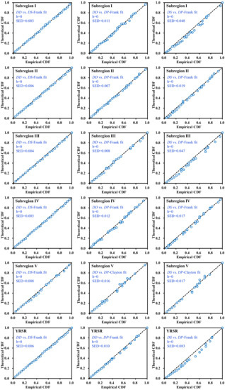Comparison between empirical and theoretical CDFs of bivariate distribution in subregions I–V and entire YRSR. The value of h is 1 if the test rejects the null hypothesis at the 5% significance level, or 0 otherwise. SED is the value of square Euclidean distance. The dotted line indicates the 1:1 line.
