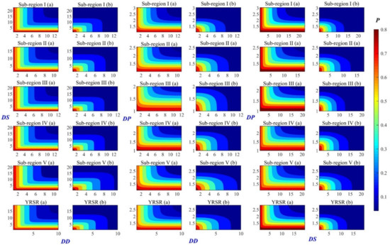 Using the selected optimal copulas in I–V subregions and the entire YRSR, the bivariate probability of DD vs. DS, DD vs. DP and DS vs. DP in both Case “∩” and Case “∪” can be estimated and the results are presented in Figure 14. For example, when the DD and DS exceed 3 months and 3, respectively (above moderate grade), the PD∩S was 0.459, 0.434, 0.453, 0.484, 0.508 and the PD∪S was 0.590, 0.580, 0.577, 0.613, 0.645 in subregions I–V, respectively. For the drought event with DD > 3 and DS > 4.5(above severe grade), the PD∩S in the five subregions was 0.435, 0.411, 0.422, 0.461, 0.489 and PD∪S was 0.478, 0.465, 0.467, 0.504, 0.537. It could be found that the joint probabilities are different among the five subregions, with significantly larger PD∩S and PD∪S in Dam River Basin and Qumar River Basin, implying that the drought risk is higher in these regions.
