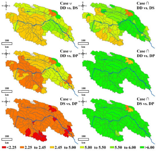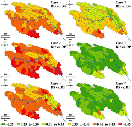 Spatial distribution of bivariate probabilities of DD vs. DS, DD vs. DP and DS vs. DP in Case ∪ and Case ∩ in the YRSR.