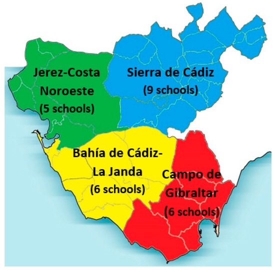 The province of Cádiz will be divided into four areas: Campo de Gibraltar (six schools), Jerez-Costa Noroeste (five schools), Sierra de Cádiz (nine schools) and Bahía de Cádiz-La Janda (six schools) (Figure 1). In each area, there will be between 200 and 300 participants and school centers belonging to both the intervention group and the control group. This division will be made to have a sample that is as representative as possible of the entire province of Cádiz.