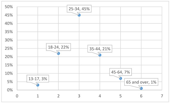 As shown in Figure 5 and Figure 6, we found that the main targets of these influencers are young women between 25 and 34 years old, followed by those between 18 and 24 and between 35 and 44. These followers are located in the Spanish cities with more inhabitants and that have similar interests related to the human body, such as clothing consumption, healthy food, diets, nutrition and fitness, which can be complemented with other interests, such as friendships, trips and photography.