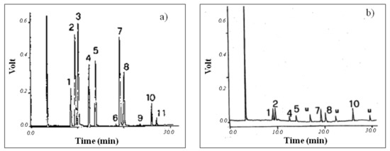 Figure 3 shows the gas chromatograms obtained by headspace analysis of a river water sample spiked with a standard solution of halocarbons (a) and a real sample (Tiber) (b).