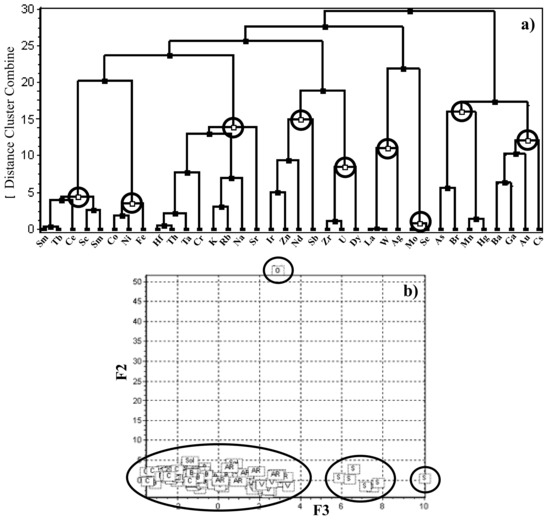 Finally, a hierarchical cluster analysis (HAC) study is performed. The correlation among elements is reported in