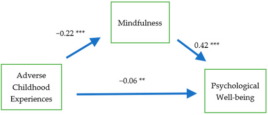 Many empirical studies on PWB have identified various factors associated with PWB [4]. Some of the factors related to the study of PWB include personality traits, self-regulation, and life experience [4,21,22,23,24,25]. Personality traits appear to be one of the most influential factors, explaining about 20–30% of variance in psychological or subjective well-being [23,25]. For example, teenage females who were more extraverted had greater PWB in midlife, contrasted by their peers with high neuroticism and lower PWB later in life [23]. Self-regulation is the ability to monitor and manage emotions, thoughts, and behaviors that, over time, help to maximize adaptive adjustment [26,27]. Capacity to self-regulate can produce the means to effectively confront and adapt to life’s challenges and increases PWB in individuals [28,29]. Studies have shown that mindfulness is strongly related to personality traits and self-regulation [30,31]. Giluk’s meta-analysis found that mindfulness displayed appreciable relationships with all big five personality traits (neuroticism, extraversion, openness to experience, agreeableness, and conscientiousness). Mindfulness showed a large and negative association with neuroticism but positive association with the other four traits [30]. Mindfulness has also been found to be associated with high self-regulation, low psychological distress, and high PWB [7,12,31]. For example, Kaunhoven and Dorjee demonstrated that mindfulness was associated with brain networks that underlie self-regulatory abilities [31]. Meanwhile, ACEs have been found to have negative effects on mental health, life satisfaction, and PWB [11,12,13]. For example, using 6323 participants from three waves of the Midlife Development in the United States study from 1995 to 2014, Mosley-Johnson and colleagues found that higher ACE counts were associated with lower life satisfaction compared to those with no ACEs [8]. In short, literature has found that ACEs are negatively associated with PWB, while mindfulness is positively associated with PWB. However, whether mindfulness mediates these effects—and the extent to which it does—is yet to be examined.