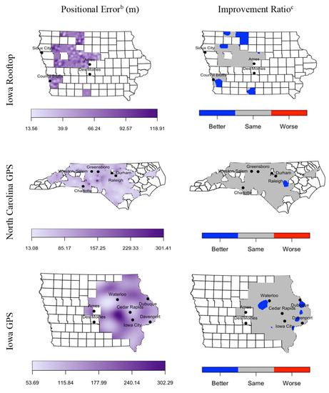 Spatially smoothed maps of positional error and improvement for each of the three reference sets are provided in Figure 1. No clear area-wide patterns emerged from the positional error maps. We noted a significant improvement in positional error in several clusters in Iowa using the GPS reference set, with the largest cluster located in central Iowa, west of the city of Waterloo. There was also a significant improvement in positional error in one area of eastern NC located southeast of the city of Raleigh. Based on Iowa rooftop coordinates, there were multiple areas of significant improvement in positional error, including the entirety of Kossuth County in north-central Iowa.