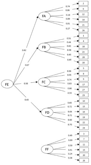 Next, we focused attention on the structural model. Firstly, we examined the equivalence in the relationships between FE and the first-order factors (FA, FB, FC, and FD) [,]. Multi-group analyses were performed imposing equality constraints on the gamma parameters. That is, all gamma parameters were constrained to be equal across gender (Model 3).