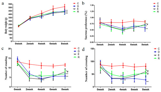 Behavioral indicators of each group were measured once a week during the experiment. As shown in Figure 2, after the four weeks of modeling, compared with group C, the BW, sucrose preference rate, and the number of crossings and standings were significantly lower in groups D, E, and R (p < 0.05 or p < 0.01), indicating that the CUMS-induced depression model was established successfully. After the four weeks of exercise intervention period, the BW, the sucrose preference rate, and the numbers of crossing and standing of the groups D, E, and R were still significantly lower than that of group C (p < 0.05 or p < 0.01). When comparing with group D, the sucrose preference rate and the numbers of crossings and standing of group E were significantly increased (p < 0.05), and the number of crossings in group R was significantly increased (p < 0.05). (See Supplementary Materials for detailed data).