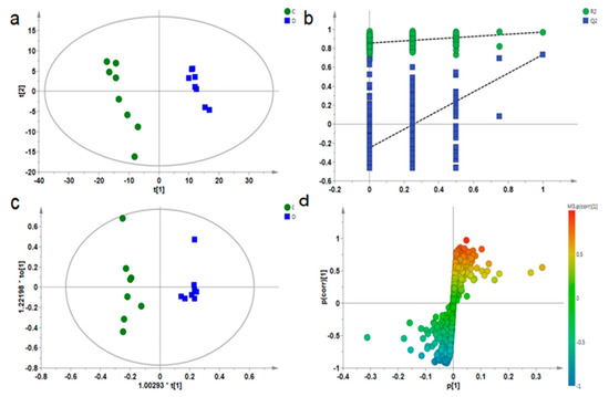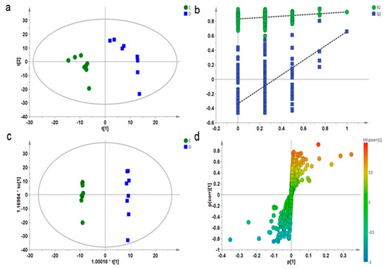 PLS-DA diagram (a), PLS-DA model verification diagram (b), OPLS-DA diagram (c), and corresponding S-plot diagram (d) for the gastrocnemius muscle samples of groups C and D.