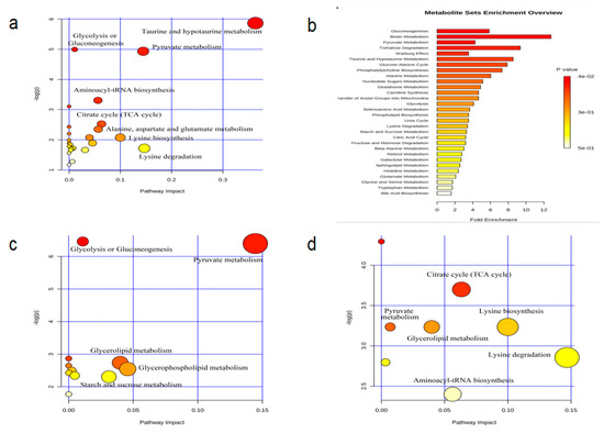 The metabolites were imported into the MetaboAnalyst 4.0 (http://www.metaboanalyst.ca (accessed on 25 November 2020)) for metabolic pathway enrichment analysis (Figure 6b and Figure 7b). On the horizontal axis, the larger the fold number, the more metabolites participated in the metabolic pathways. On the vertical axis, the darker (redder) the color, the more obvious the changes in metabolic pathways [24]. Therefore, MetPA analysis can explain the extent to which the metabolites or metabolic pathways have an impact on body metabolism. Moreover, MetPA analysis results (Figure 6a,c and Figure 7a,c) were consistent with enrichment analysis results. Holm p-value, FDR (False Discovery Rate), and Impact value were integrated to find that rats in group D regulated gastrocnemius muscle metabolism mainly through eight metabolic pathways (Figure 6a), including that of the glycolysis or gluconeogenesis, pyruvate metabolism, citrate acid (TCA) cycle, aminoacyl-tRNA biosynthesis, alanine-aspartate-glutamate metabolism, lysine biosynthesis, lysine degradation, and taurine-hypotaurine metabolism. Changes were observed in metabolite levels of various metabolic pathways such as glycolysis or gluconeogenesis, pyruvate metabolism, glycerophospholipid metabolism, glycerolipid metabolism, and starch-sucrose metabolism, in the gastrocnemius after endurance exercise (Figure 6c). Resistance exercise mainly improved the stress by regulating the metabolic pathways of pyruvate metabolism, TCA cycle, glycerolipid metabolism, aminoacyl-TRNA biosynthesis, lysine biosynthesis, and lysine degradation, in the gastrocnemius (Figure 6d).