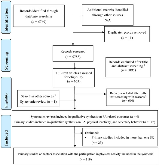 Our search strategy identified four SRs that included 142 primary studies reporting on factors (barriers or facilitators) associated with PA in at least one of the 20 MENA countries (Figure 1). After excluding primary studies included in more than one SR (n = 23), we considered a total of 119 studies for the qualitative synthesis.