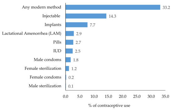 Proportion of women using contraceptive methods by contraceptive type in Kagera and Mara regions, Tanzania (n = 1184).