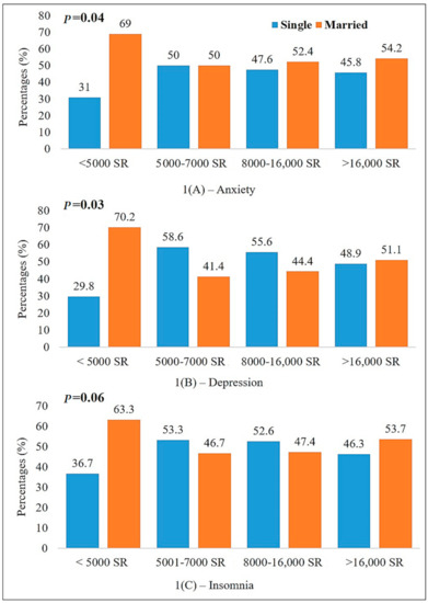 Lastly, Figure 1 shows the prevalence of mental disorders according to income and marital status and showed a significantly higher prevalence of anxiety (1A) and depression (1B) and borderline significance in insomnia (1C) among married participants whose income was below 5000 SR (p-values 0.04, 0.03, and 0.06, respectively).