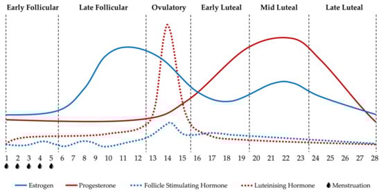 The fluctuations in female sex hormones, such as estrogen, progesterone, follicle stimulating hormone (FSH) and luteinising hormone (LH), presented in Figure 1, characterise the sub-phases of a eumenorrheic MC [].