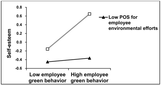 The moderating effect of POS for employee environmental efforts: EGB and POS for employee environmental efforts both had a significant positive impact on self-esteem, respectively (Table 5). We further tested the hypothesized moderating effect of POS for employee environmental efforts on the relationship between EGB and self-esteem by entering the interaction terms between EGB and POS for employee environmental efforts. The results indicate that the interaction between EGB and POS for employee environmental efforts is significantly positively related to self-esteem (model 4, β = 0.222, p < 0.001), thus supporting Hypothesis 6. In order to more vividly present the moderating effect of POS for employee environmental efforts, we plotted interaction effects at different levels of POS for employee environmental efforts. As illustrated in Figure 2, the results reveal higher levels of POS for employee environmental efforts and higher levels of self-esteem, indicating a stronger positive relationship with regard to self-esteem. Therefore, Hypothesis 6 is again supported.