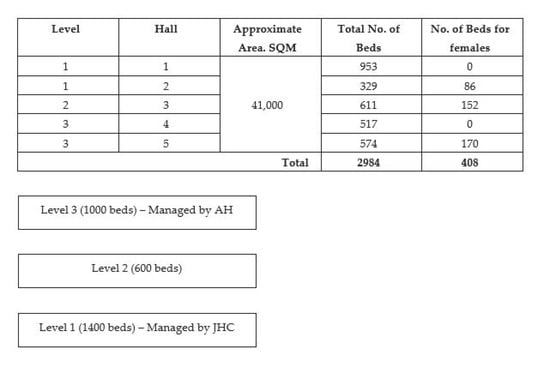 Similarly, in Korea, community treatment centers (CTCs) were repurposed from existing buildings. Gyeongbuk-Daegu 7 CTC was one of the largest CTCs set up in Korea to deal with the COVID-19 pandemic; it was repurposed from a previous dormitory [,]. In Wuhan, China, similar concepts involving Fangcang shelter hospitals, with a 1600 bed capacity, were refurbished into temporary healthcare sites from existing exhibition centres and stadiums [,]. In addition, Wuhan KeTing Medical shelter hospital was built from the previous Wuhan Culture and Art Center, with a bed capacity of 1461 [].