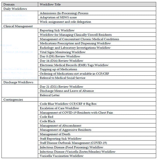 A repertoire of clinical and operational workflows was carefully drafted and collated. These workflows were designed to guide the ground team on the daily work processes and to maintain high care standards. As the management of COVID-19 is a rapidly evolving field, with newly updated knowledge and evidence made available every day, the workflows were progressively and continually updated and made relevant by the team on a regular basis. Inputs and advice from various domain experts were sought and adapted into the workflow considerations. A table depicting some of the important workflows is illustrated in Figure 4.