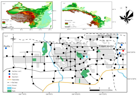 Baiyin city is located close to the northwest margin of the Chinese Loess Plateau (Figure 1a), and has a semi-arid climate (mean annual precipitation approximates 250 mm). The surrounding landscape is characterized by gray calcareous soil and is covered by true temperate steppe vegetation. In the urban area, the soil derived from loess material and yields a sandy loam texture, with low organic matter content (mean 1.85%) [21]. Baiyin is an important non-ferrous metals mining and smelting city in China. Several large mining and industrial companies, occupying a vast area, were established to extract lead-zinc, copper and polymetallic ores during the 1970’s. Nowadays, Baiyin is declining as the resources are becoming exhausted.