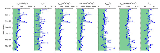 Atmospheric dustfall samples present the greatest mean χlf value of 625 × 10−8 m3 kg−1 (Figure 4), which is significantly higher than that for cities much larger than Baiyin, such Beijing [14], Xi’an [32], Lanzhou [34] and Urumqi [29] (Table 2). Moreover, χlf values of dustfall in these large cities exhibit seasonal variations, with higher χlf values during winter (Dem - Feb) and lower values during summer and autumn, in association with coal combustion processes [34]. In the Baiyin study, highest χlf values are evident in the winter of 2012 and 2013, and slightly higher χlf values in winters of 2014, 2015 and 2016. In addition, the mean value of χlf presents clear annual variations and a decreasing trend (827 × 10−8 m3 kg−1, 848 × 10−8 m3 kg−1, 660 × 10−8 m3 kg−1, 543 × 10−8 m3 kg−1, 463 × 10−8 m3 kg−1, 472 × 10−8 m3 kg−1 for the years of 2012, 2013, 2014, 2015, 2016 and 2017, significantly), especially since 2014 (Figure 4). These results suggest that the contribution of industrial processes to atmospheric dustfall is falling with time. The ratio of S−100 enables the distinction of ferrimagnetic components from hard coercivity antiferromagnetic components. The higher values of S−100 (mean values = 84.34%) reflect the relatively high concentration of ferrimagnetic material (e.g., magnetite).
