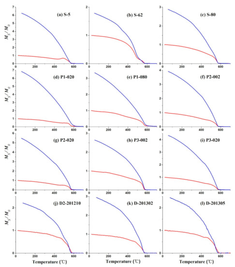Thermomagnetic curves of typical soil samples. The red line is the heating curve, blue line is the cooling curve.