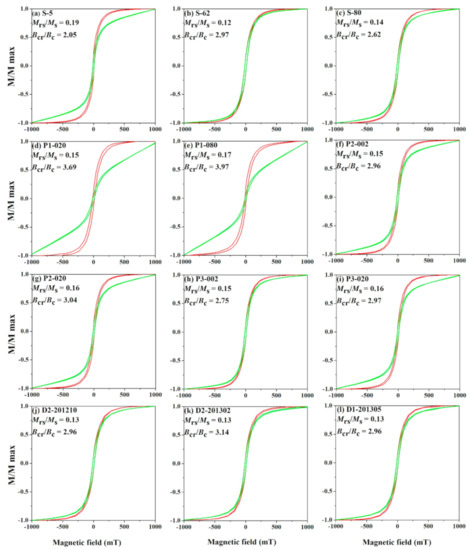 - Dunlop, D.J. Theory and application of the Day plot (Mrs /Ms versus Hcr/Hc) Theoretical curves and test using titanomagnetite data. J. Geophys. Res. 2002, 107, 1–22. [Google Scholar] [CrossRef]