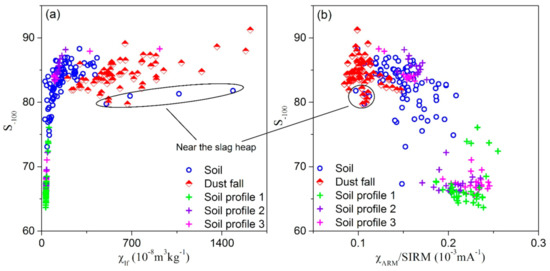 Urban particulate pollution is mainly a consequence the burning of coal and industrial processes in the cities of Northern China. In our study, the ferrimagnetic mineral content of dust samples during 2014 and 2017 were significantly lower than those in 2012 and 2013, which is suggested as relating to regional economic transformation. The mines of Baiyin City are today already exhausted, or nearly exhausted, after 50 to 60 years’ exploitation and the copper and lead-zinc smelter plant enterprises have been either discontinued or running at half capacity since 2014. Plotting S−100 against χlf and/or χARM/SIRM (Figure 8) further illustrates that the atmospheric dustfall plot cluster in a well-defined group, with increasing values of χlf, low χARM/SIRM and relatively stable high S−100 values, indicating an important contribution from industrial emissions, such as fly ash derived from industrial combustion [16,48]. In contrast, surface soil samples gathered near the slag heap plot occupy a tightly clustered group exhibiting high χlf, lower χARM/SIRM and lower S−100 values, suggesting relatively lower magnetite concentrations and finer ferrimagnetic grains compared with atmospheric dustfall. Therefore, the magnetic parameters of samples identify specific pollution signals for different environmental carriers, and reflect spatial and temporal changes in pollution sources in Baiyin city.